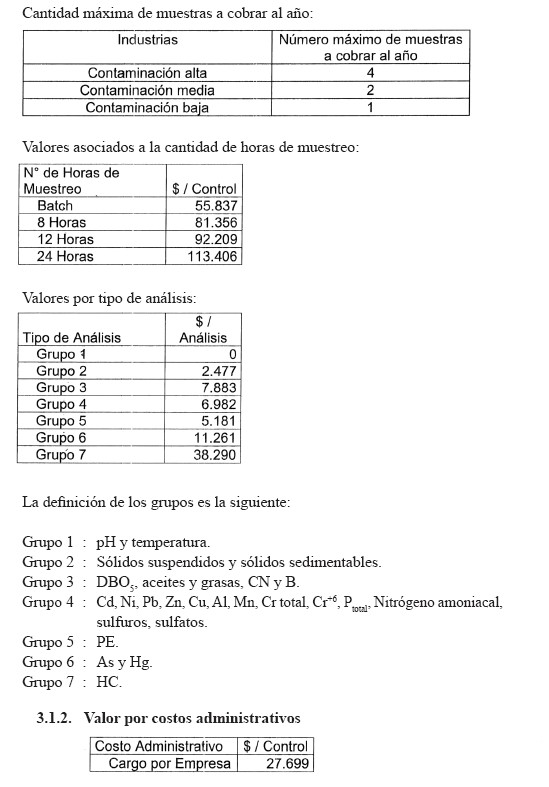 El valor por cada control directo de Riles será igual a la suma de los valores asociados a los conceptos de cantidad de horas de muestreo, tipos y cantidad de análisis efectuados y costo administrativo que se señalan más adelante. Los tipos de análisis a efectuar estarán en función de la actividad económica y al CIIU (Clasificación Industrial Internacional Uniforme) de la misma.