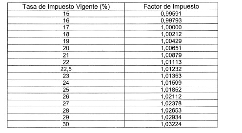 Los valores resultantes de la aplicación de los cargos anteriormente mencionados en este decreto, se incrementarán en función de la tasa de tributación vigente que grava las utilidades de las sociedades anónimas abiertas, considerando los factores para las tasas de tributación que se indican a continuación (tasas intermedias se interpolarán linealmente):