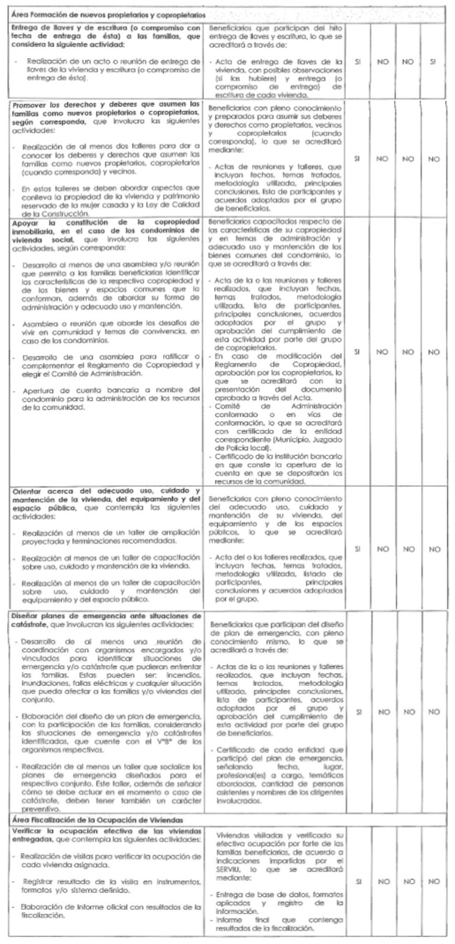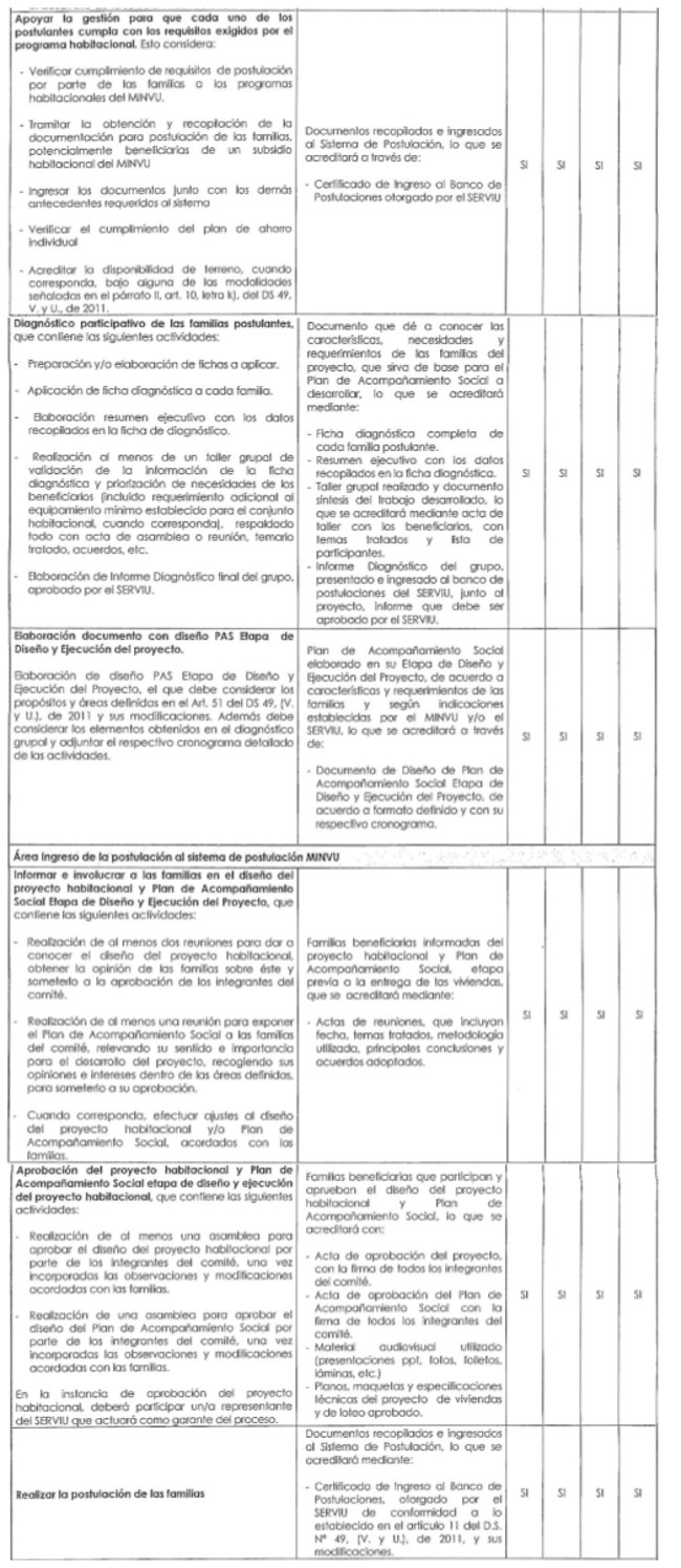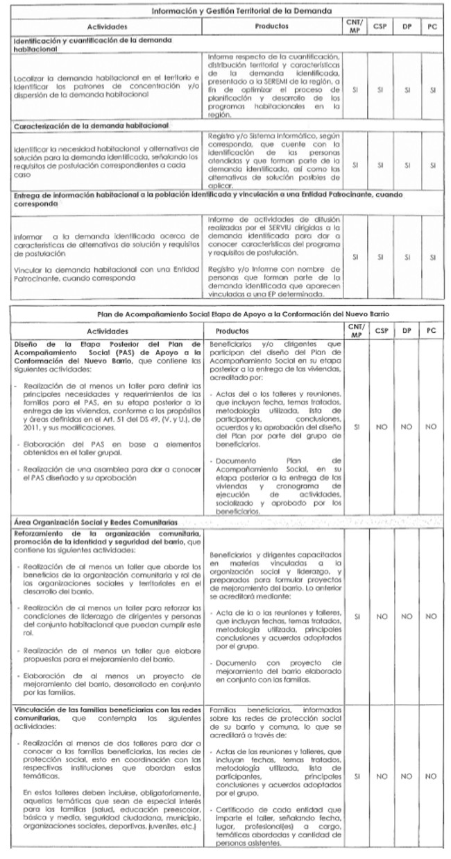D.O. 18.01.2018Servicio Acompañamiento Social en la Etapa de Apoyo a la Conformación del Nuevo Barrio, que podrá ejecutar el Serviu directamente o contratarlo con personas naturales o jurídicas, inscritas en el Registro de Consultores del Minvu, regulado por el DS N° 135 (V. y U.), de 1978, Título IV, Rubro Prestaciones de Asistencia Técnica, comprende tareas de apoyo para reforzar la organización social y la vinculación de las familias con las redes comunitarias, la formación de propietarios y copropietarios y la fiscalización de la ocupación de las viviendas, entre otros.