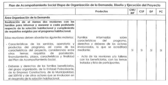 2.1.- Servicio de Plan de Acompañamiento Social - Etapa Organización de la Demanda, Diseño y Ejecución del Proyecto, que comprende, para la Organización de la Demanda, la asesoría a la organización de las familias postulantes, recopilación de los antecedentes técnicos y sociales correspondientes para su presentación a Serviu, junto al proyecto habitacional, a fin de participar del respectivo proceso de postulación. El Plan de Acompañamiento Social - Etapa Diseño y Ejecución del Proyecto, incluye las tareas de aprobación del proyecto habitacional, seguimiento de éste durante su ejecución y preparación para asumir el rol como futuros propietarios y copropietarios, cuando corresponda.