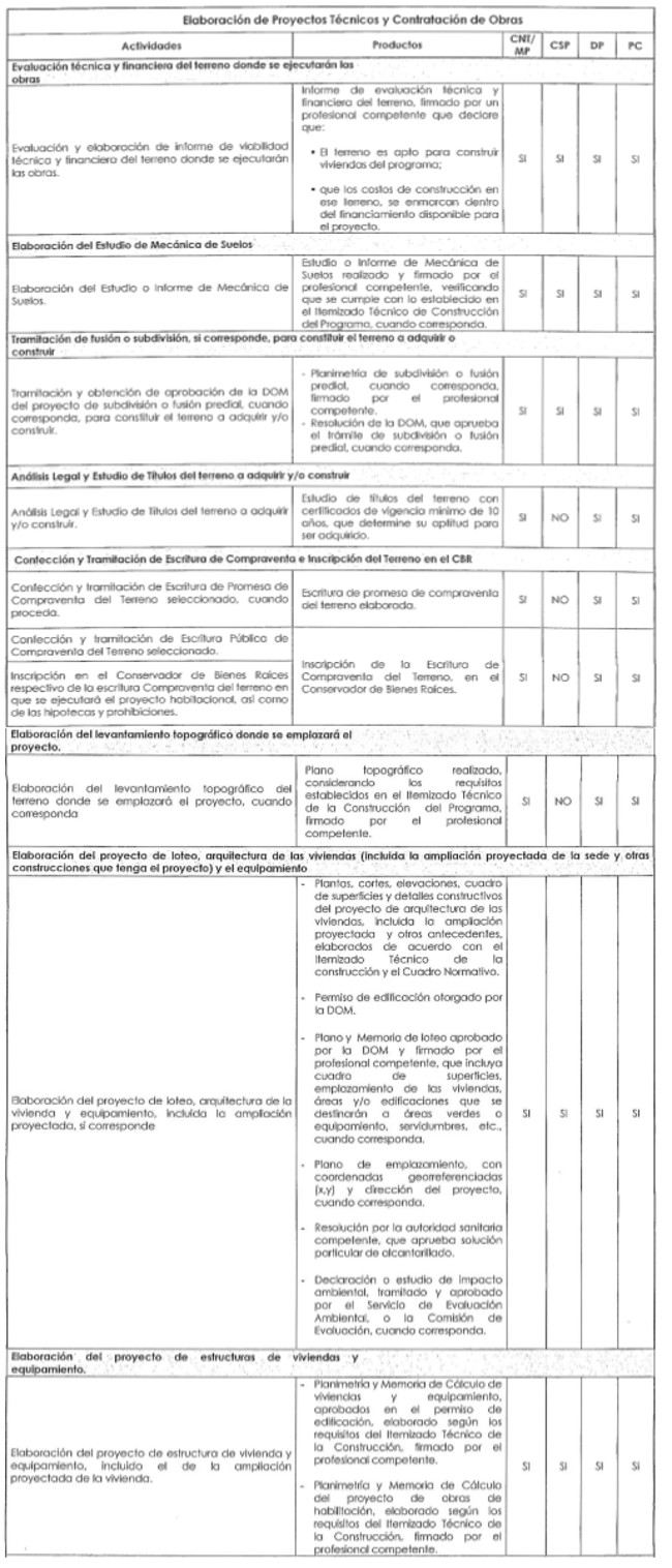 2.2.- Servicio de Elaboración de Proyectos Técnicos y Contratación de Obras, que comprende la búsqueda y selección de terreno, cuando corresponda, la elaboración, tramitación y aprobación de los proyectos de arquitectura, ingeniería, instalaciones domiciliarias, loteo y urbanización, la contratación de obras y la tramitación y aprobación del contrato de compraventa del terreno, cuando corresponda.