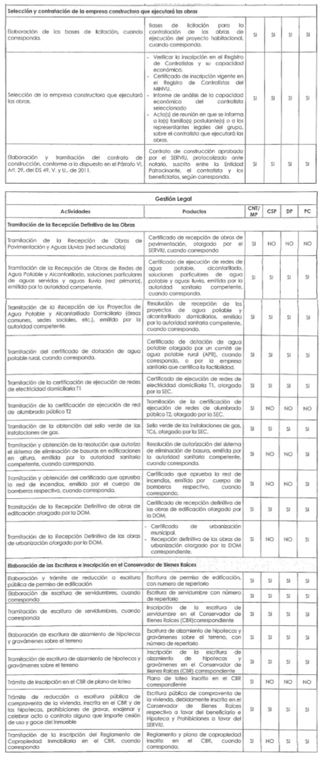 D.O. 18.01.2018de Gestión Legal, que comprende las tareas de apoyo en materia jurídica para el desarrollo y ejecución del proyecto y los trámites para la recepción de obras por parte de la DOM y, posteriormente de Serviu, la elaboración y tramitación e inscripción de las escrituras de la vivienda, así como de las prohibiciones y gravámenes. Este servicio puede ser realizado por la Entidad Patrocinante o la Empresa Constructora, a petición expresa de esta última.