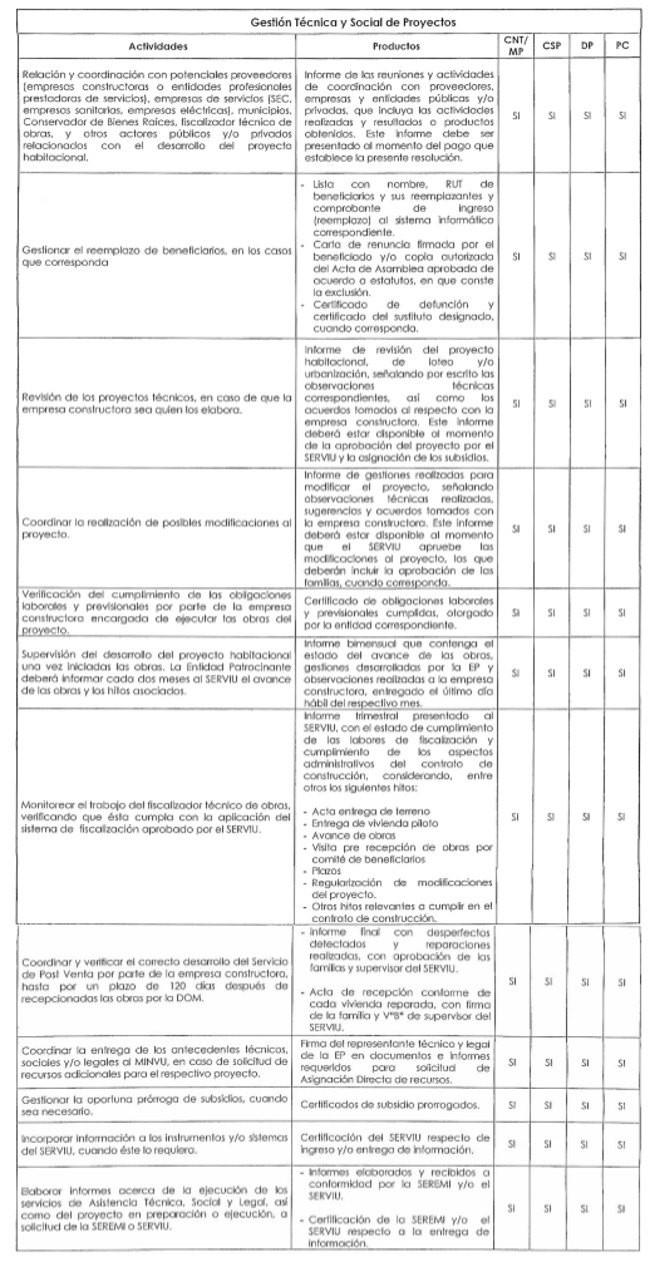 2.4.- Servicio de Gestión Técnica y Social de Proyectos, que comprende la realización de actividades de seguimiento del proyecto habitacional en todas sus etapas, así como la relación y coordinación con entidades públicas y privadas vinculadas a su desarrollo. También incluye la elaboración y presentación de informes técnicos, la tramitación de modificaciones al proyecto, la supervisión de su ejecución, el servicio de post venta, entre otras.