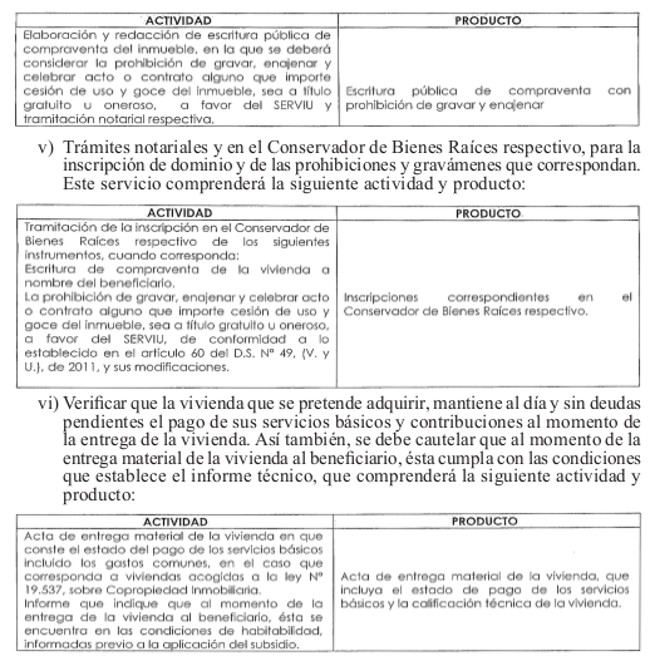 Cuando se trate de adquisición de vivienda nueva, corresponderá al vendedor de las viviendas construidas nuevas realizar las labores y actividades señaladas en el número 1, letra d) de este artículo, cuando aquello corresponda, por cuya realización no le corresponderá retribución alguna, debiendo en todo caso el beneficiario acompañar, para la aplicación del subsidio a una vivienda que sea objeto del Programa, los documentos necesarios que acrediten la obtención de los productos establecidos en el numeral indicado, lo que será finalmente visado por el Serviu. Será igualmente responsabilidad de Serviu (y no del vendedor), la realización del informe técnico de la vivienda que se pretende adquirir, a fin de determinar que cumple con las condiciones de habitabilidad en todos sus recintos y, la tasación comercial de la vivienda, aplicando la metodología descrita en el Manual de Tasaciones para el Subsidio Habitacional aprobado por resolución del Minvu.