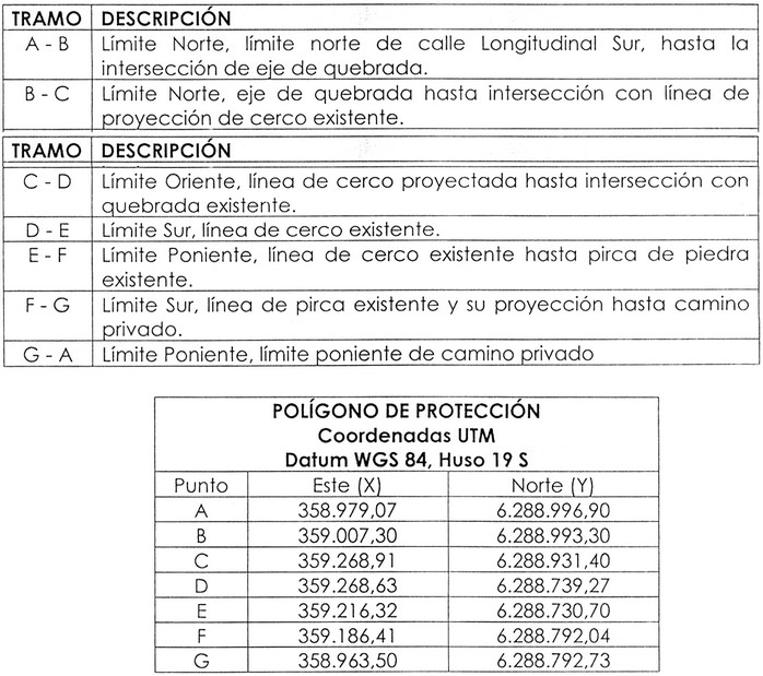 El área del polígono protegido tiene una superficie aproximada de 52.845,27 mts.², aproximadamente 5,28 ha, según se delimita por el polígono A-B-C-D-E-F-G-A del plano adjunto, que forma parte del presente decreto.