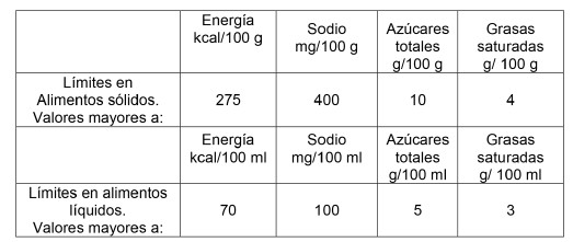 Tabla Nº1: Límites de contenido de energía, sodio, azúcares totales y grasas saturadas en alimentos.