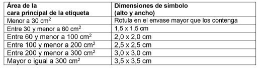 Las dimensiones del o los símbolos referidos estarán determinadas de acuerdo al área de la cara principal de la etiqueta, según el cuadro siguiente: