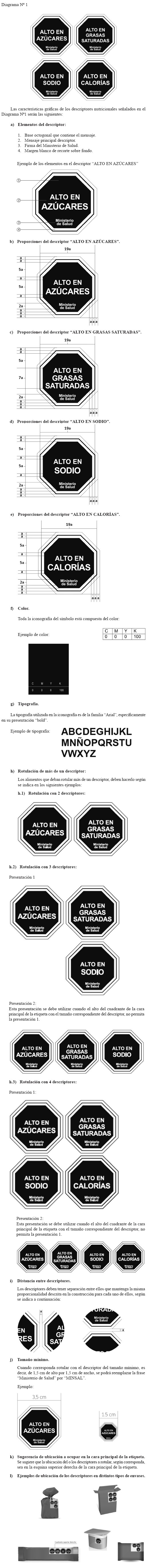 La forma de destacar las características nutricionales indicadas en el inciso primero de este artículo será rotulando un símbolo octagonal de fondo color negro y borde blanco, y en su interior el texto "ALTO EN", seguido de: "GRASAS SATURADAS", "SODIO", "AZÚCARES" o "CALORÍAS", en uno o más símbolos independientes, según corresponda. Las letras del texto deberán ser mayúsculas y de color blanco. Además, en el mismo símbolo, deberá inscribirse en letras blancas, la frase "Ministerio de Salud", según el diagrama Nº 1 del presente artículo.