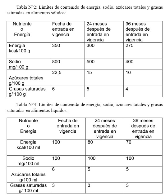 Artículo 2º.- Sin perjuicio de lo indicado en el artículo 1º transitorio de este decreto, los límites de contenido de energía, sodio, azúcares totales y grasas saturadas indicados en la Tabla Nº 1 del artículo 120 bis entrarán en vigencia en forma progresiva, según se indica en las Tablas Nº 2 y Nº 3 siguientes:
