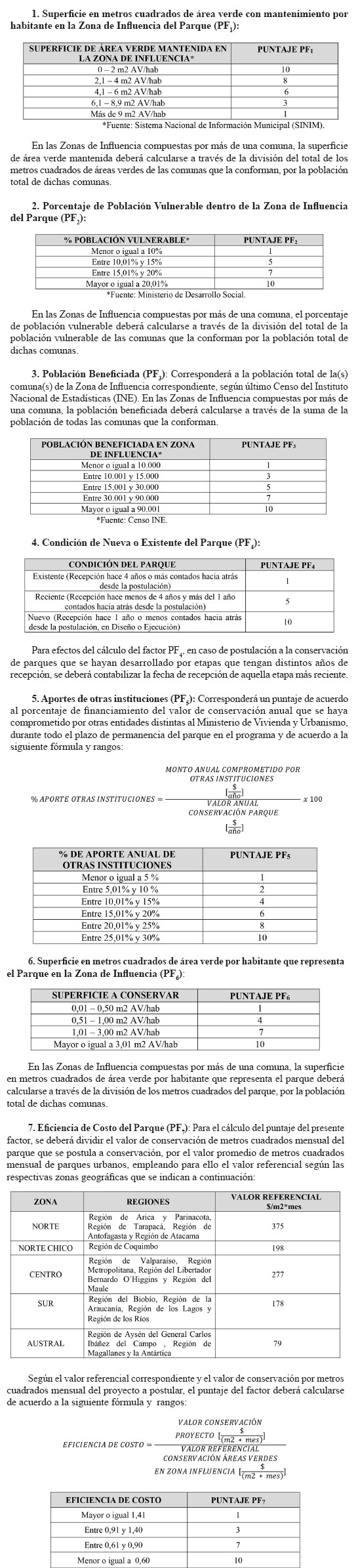 10. Pertenencia a un Sistema de Parques (PF10): Corresponderá un puntaje PF10=10 para aquellos parques que formen parte de un sistema mayor de parques urbanos o que correspondan a una etapa o etapas de un parque mayor. En caso de parques que no formen parte de un sistema mayor, le corresponderá un puntaje PF10=1.