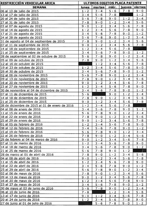 1. Prohíbase la circulación de los vehículos de transporte público urbano del tipo Taxi, que funcionan en las modalidades de Básico, Turismo y Colectivo Urbano, por las calles incluidas en la red vial básica de la ciudad de Arica, durante el período comprendido entre el 3 de julio de 2015 y 1 de julio de 2016, de acuerdo al último dígito de su placa patente única, según el siguiente calendario: