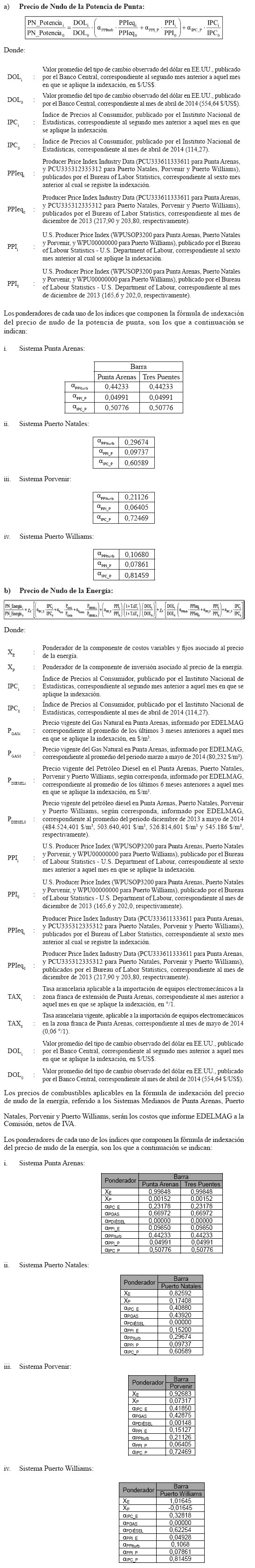 Las fórmulas de indexación aplicables a los precios de nudo en las barras de retiro de los Sistemas Medianos de Punta Arenas, Puerto Natales, Porvenir y Puerto Williams son las siguientes: