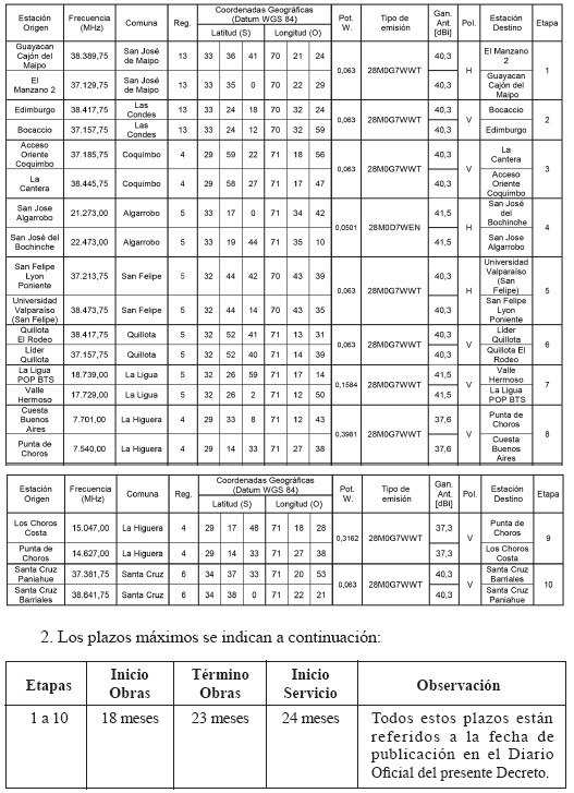 1. Autorízase a la concesionaria a Instalar, operar y explotar diez (10) radioenlaces punto a punto, cuyas características se indican a continuación.