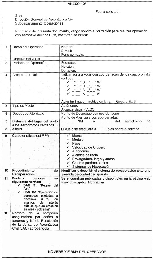 (b) Dicha autorización será otorgada para cada operación (caso a caso), previa entrega por parte del solicitante del formulario Anexo "D" debidamente completado y siempre que la DGAC evalúe que operación prevista no constituya riesgo para las personas o para otras aeronaves.
