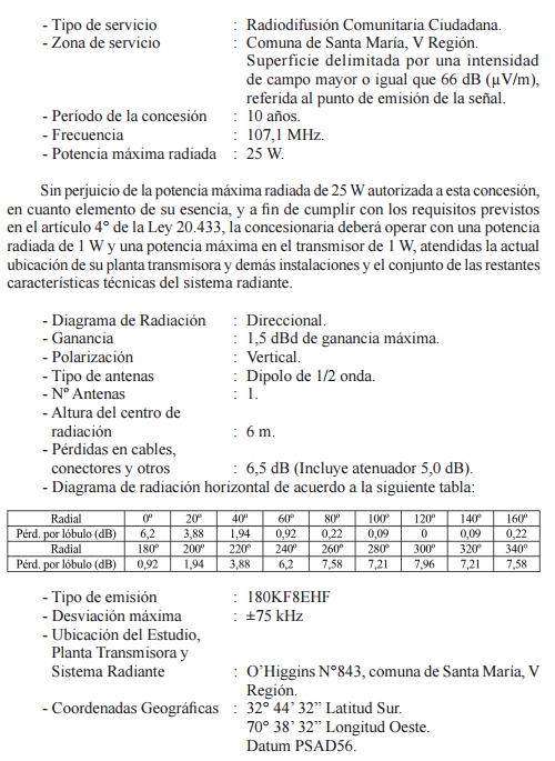 OTORGA CONCESIÓN DE RADIODIFUSIÓN COMUNITARIA CIUDADANA PARA LA COMUNA DE SANTA MARÍA