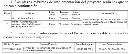 b) El acta del 18.12.2014, correspondiente a la cuadragésima segunda sesión del Consejo de Desarrollo de las Telecomunicaciones que resolvió adjudicar el proyecto de "Servicio de Telecomunicaciones para Zonas WiFi" Fase 3 y sus respectivos Subsidios, Código Proyecto: FDT-2014-01-08A, a la empresa Pacífico Cable SpA.
