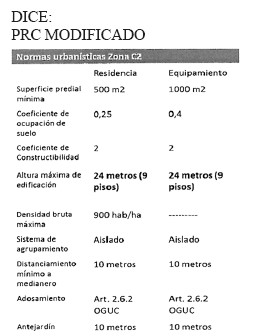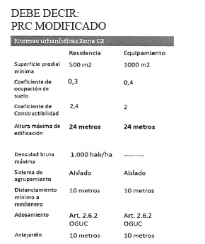 Modifíquese el decreto alcaldicio Nº 1.857, de fecha 2 de octubre de 2015, en lo que dice relación a la tabla Nº 15 del Plan Regulador Comunal "PRC Modificado", donde dice "Coeficiente de Ocupación de Suelo" en columna "Residencia" 0,25 debe decir "0,3"; donde dice "Densidad bruta máxima" en columna "Residencia" 900 hab/ha debe decir "1.000 hab/ha", y en "Coeficiente de Constructibilidad" en columna "Residencia" donde dice 2, debe decir "2,4" quedando la tabla del PRC modificado con la siguiente normativa: