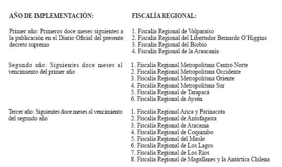 Artículo único.- Defínense las regiones en las cuales se implementará gradualmente en las respectivas Fiscalías Regionales, en un plazo de tres años, el Sistema de Análisis Criminal y Focos Investigativos a que se refiere el artículo 37 bis de la ley Nº 19.640, Orgánica Constitucional del Ministerio Público, introducido por la ley Nº 20.861, de acuerdo a la siguiente puesta en funcionamiento sucesiva por año: