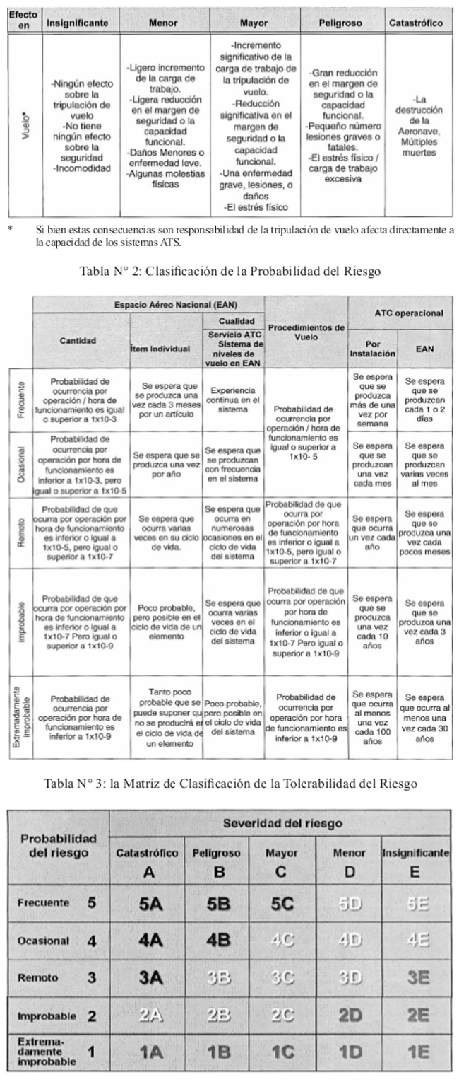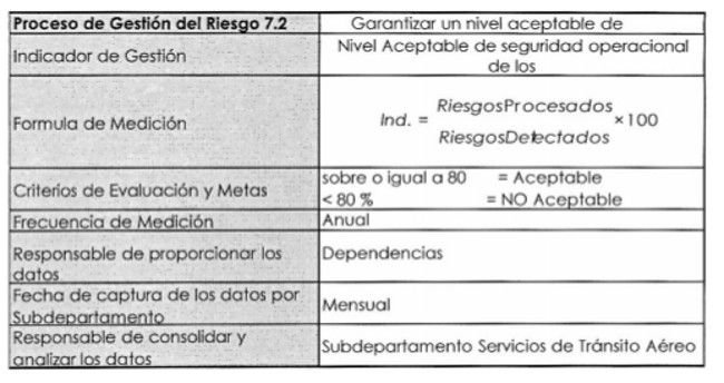 . 7.2 Identificación y análisis de peligros. La categorización de las amenazas en el control de tránsito aéreo, las cuales servirán como base para la identificación de peligros y una posterior mitigación de los riesgos, se agruparán de la siguiente manera: a) Internas del proveedor ATS; y b) Externas al proveedor ATS. 7.3 Métodos para la Identificación de peligros 7.3.1 Para la identificación de peligros se pueden utilizar, de acuerdo a la información que se posea, cualquiera de los tres métodos siguientes, no siendo excluyentes: a) Método Reactivo b) Método Proactivo C) Método Predictivo 7.3.2 Método Reactivo Se basa en el histórico de incidentes o accidentes que han ocurrido dentro de la dependencia. Para esto es necesario que cada aeródromo elabore un listado de peligros, los que se deben incluir en la matriz de riesgos, considerando para ellos los datos disponibles relacionados con incidentes o accidentes que hayan ocurrido. Posterior y en la misma matriz, se debe clasificar qué tipo de peligro se trata. De igual forma se deben contabilizar la cantidad de veces que este peligro derivó en un accidente o incidente. Del mismo modo se debe indicar el método utilizado para la detección del peligro, para este caso Reactivo. 7.3.3 Método Proactivo Se basa en la búsqueda de peligros en las actividades del aeródromo, con el fin de detectar riesgos asociados y proponer medidas para la mitigación de estos, antes que se transforme en un incidente. 7.3.4 Método Predictivo El método predictivo captura la actuación del sistema como sucede en las operaciones normales en tiempo real para identificar posibles problemas futuros. 7.4 Definición del nivel aceptable de seguridad para los servicios de tránsito aéreo 7.4.1 El nivel aceptable de seguridad para los servicios de tránsito aéreo será mantener un indicador de nivel nacional sobre un ochenta por ciento (80%), que se calculará de la siguiente forma: Donde "Riesgos Detectados" será la sumatoria de todos los riesgos detectados e informados por las dependencias a través de la matriz de riesgo. "Riesgos Procesados" será la sumatoria de todos los riesgos que estén en proceso formalmente para obtener su mitigación y/o mitigados, según lo informado por cada dependencia. 7.4.2 El Subdepartamento Servicios de Tránsito Aéreo revisará el nivel aceptable de seguridad operacional, para generar su propuesta de mejora continua cada tres (03) años. 7.4.3 El Subdepartamento de Servicios de Tránsito Aéreo recopilará los datos a mes vencido dentro de los primeros cinco (5) días hábiles del mes siguiente, según la información remitida por todas las dependencias que presten servicios de control y AFIS. 7.4.4 Los niveles aceptables de seguridad operacional para los Servicios de Tránsito Aéreo se establecerán según las tablas Nº 1, 2 y 3 siguientes: