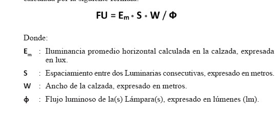 3.11 Factor de utilización (FU): Relación entre el Flujo luminoso procedente de la Luminaria que llega efectivamente a la superficie a iluminar y el Flujo luminoso emitido por la(s) Lámpara(s) instalada(s) en la Luminaria. Corresponde a la calculada por la siguiente fórmula: