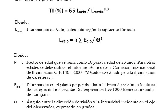 3.18 Incremento de umbral (TI): Corresponde al incremento en el contraste para volver a percibir un objeto de prueba tras un deslumbramiento. Se calcula de acuerdo a la siguiente fórmula:
