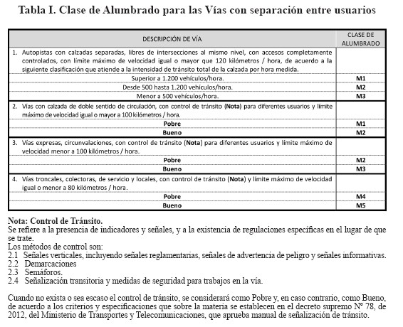 De acuerdo a ello, las respectivas clases de alumbrado se clasifican de M1 a M5, según se establece en la Tabla I. Clase de Alumbrado para las Vías con separación entre usuarios.