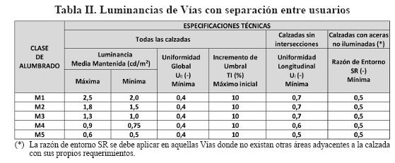 Los requisitos de iluminación que deberán cumplir las Vías con separación de los diferentes usuarios se basan en valores de Luminancia media mantenida (Lm) de la superficie de la calzada, Uniformidad global (U0) y Uniformidad longitudinal (4), Razón de entorno (SR) e Incremento de umbral (TI), establecidos en la Tabla II. Luminancias de Vías con separación entre usuarios, valores que son de aplicación a superficies de calzadas secas.