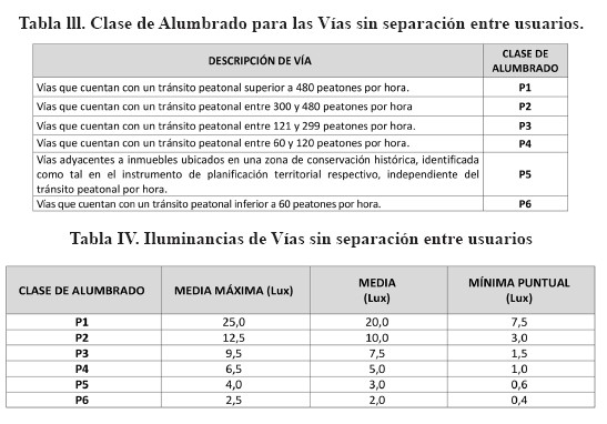 De acuerdo a ello, las respectivas clases de alumbrado se clasifican de P1 a P6, según se establece en la Tabla III. Clase de Alumbrado para las Vías sin separación entre usuarios.