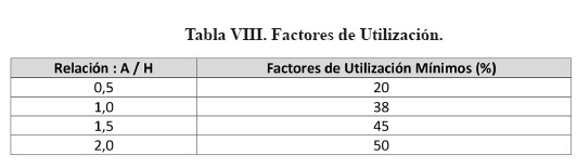 32.4.6 Factor de utilización del proyecto para cada una de sus distintas etapas, expresado en función de la fórmula A/H, donde "A" representa el ancho de la calzada y "H" la altura de montaje. El Factor de utilización debe cumplir con los valores mínimos establecidos en la Tabla VIII. Factores de Utilización.