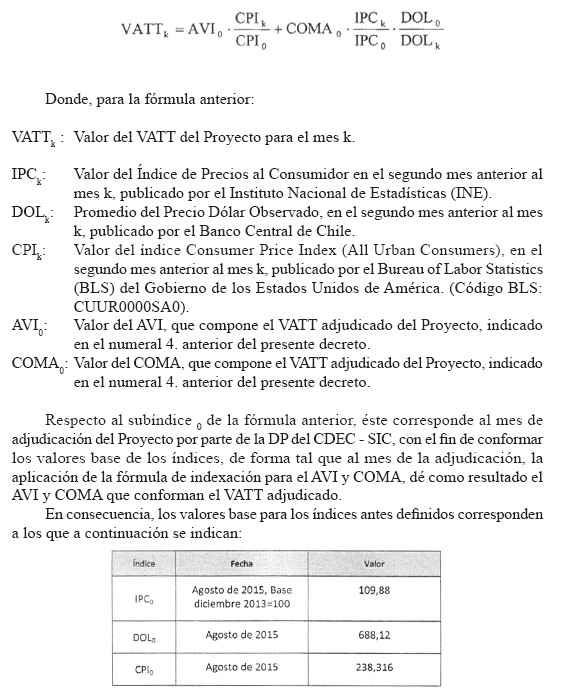 De acuerdo a lo especificado en las Bases de Licitación, el VATT del Proyecto de la Empresa Adjudicataria se reajustará anualmente, en dólares de los Estados Unidos de América, según la siguiente fórmula de indexación, de acuerdo a la variación de sus componentes AVI y COMA: