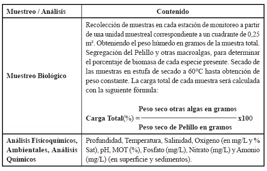 Paralelamente a la realización del diagnóstico, el Servicio elaborará un Plan de Monitoreo del área, el cual será ejecutado por un centro de investigación, considerando para ello las estaciones propuestas en el informe técnico Nº 273, citado en Vistos. El referido Plan de Monitoreo deberá considerar, al menos, los siguientes análisis: