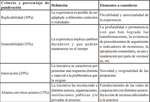 Para realizar la selección de las experiencias, iniciativas y proyectos se considerarán cuatro criterios generales. Entendidos como elementos que definen a la propuesta como una buena práctica: