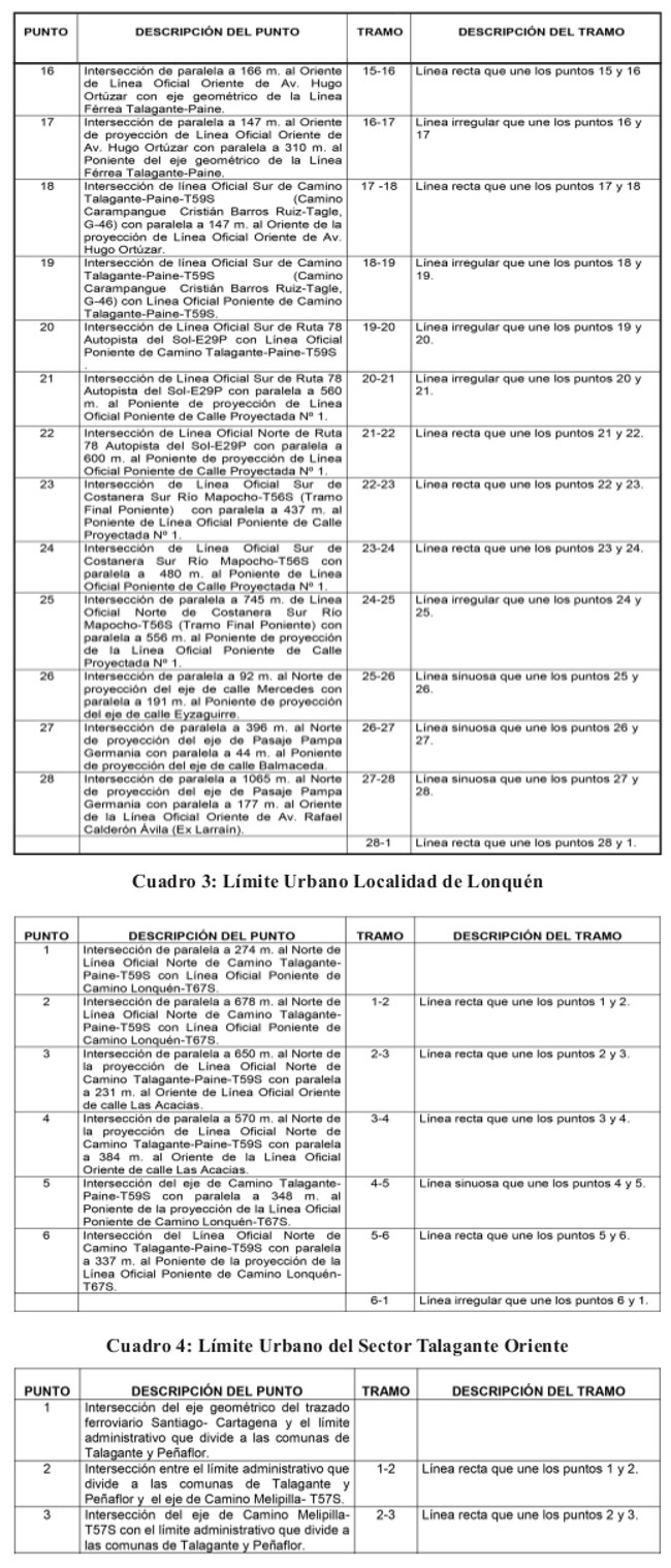 Los Límites Urbanos del presente Plan Regulador aparecen graficados en los planos PRC Talagante - ZUS - 01 a 02, PRC Lonquén - ZUS - 01 y PRC Talagante Oriente - ZUS 01. Los límites urbanos corresponden a la poligonal que se describe a continuación: