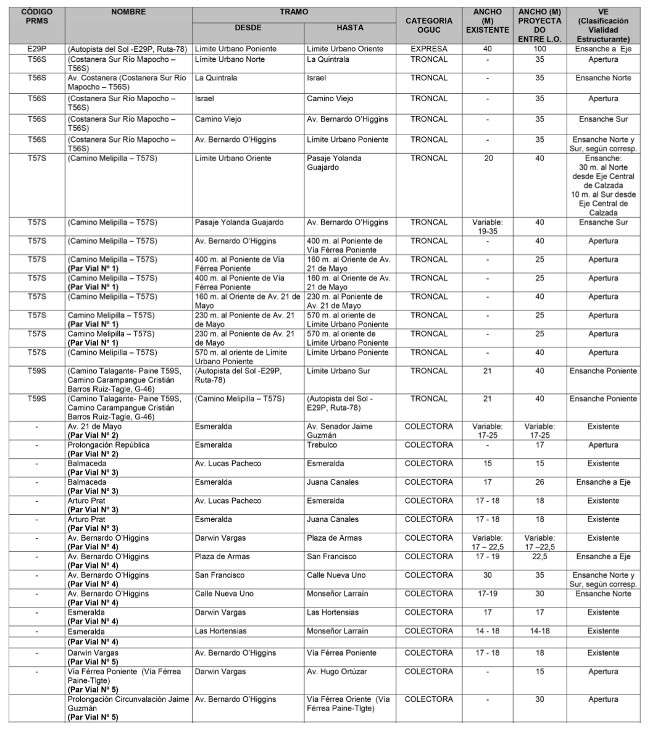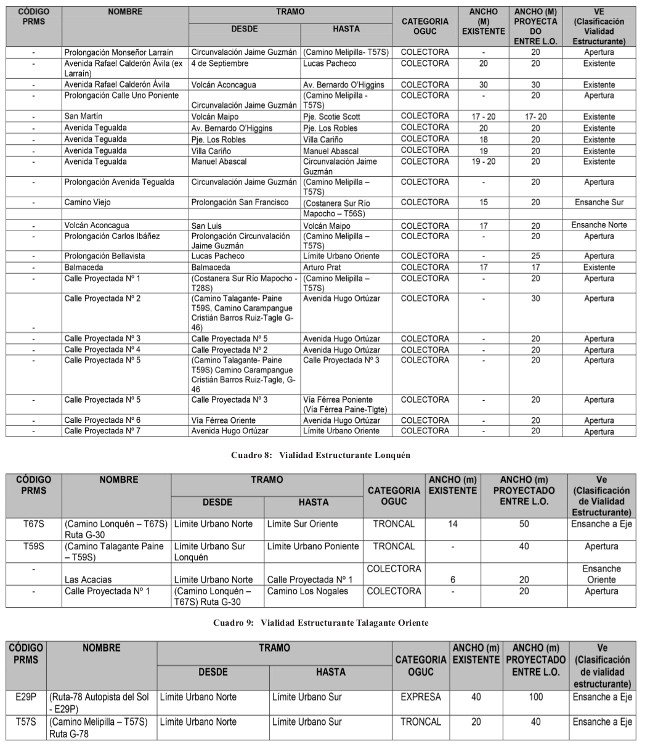 La vialidad urbana del Plan consulta vías estructurantes existentes y propuestas, cuya descripción y características aparecen graficadas en los planos: PRC - Talagante EVAV 01 y 02, PRC - Lonquén - EVAV 01 y PRC - Talagante Oriente EVAV - 01, y se detallan en los cuadros 7, 8 y 9 de la presente Ordenanza.