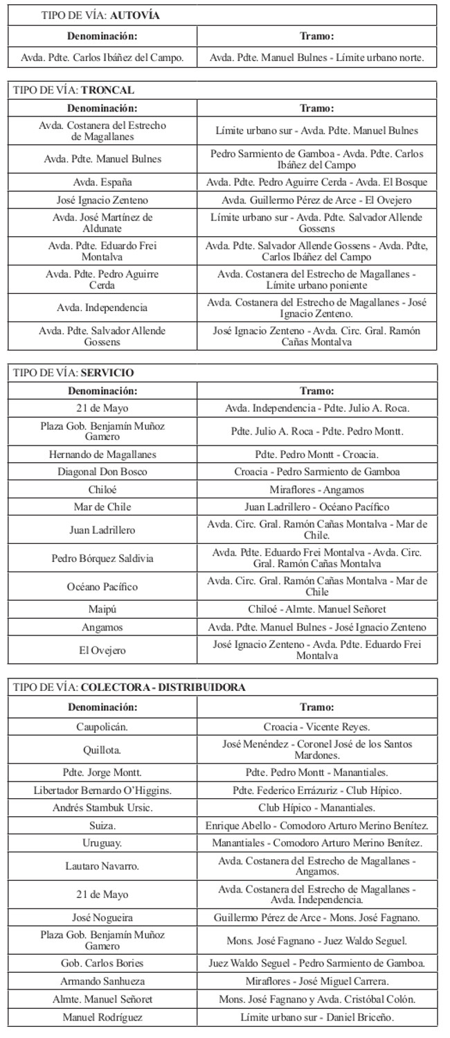 1. Reemplázase, en el numeral 1º de la resolución exenta Nº 66, del 25 de mayo de 1998, de la Secretaría Regional Ministerial de Transportes y Telecomunicaciones, de la Región de Magallanes y Antártica Chilena, el listado que contiene las vías que conforman la Red Vial Básica de la ciudad de Punta Arenas, las que quedan agrupadas en las categorías que a continuación se indican: