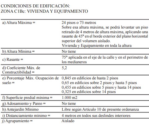 - Reemplácese en Tabla síntesis de condiciones de edificación por zonas de: centro y subcentro, preferentemente residencial, Mixtas, Equipamiento y especiales, en fila ZEC-1, en la columna correspondiente a densidad Bruta Máxima (Hab/há) la expresión "1.300 Hab/há" por la siguiente nueva expresión "1.560 Hab/há".