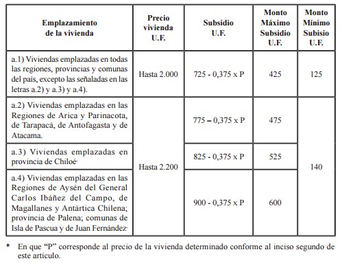 c) Tratándose de la adquisición de una vivienda económica que se origine de la rehabilitación de un inmueble ubicado en áreas declaradas como Zonas de Conservación Histórica o Zonas Típicas o Pintorescas o se trate de Inmuebles de Conservación Histórica o Monumento Histórico, los beneficiarios de este Título podrán obtener un subsidio que se determinará de acuerdo a lo dispuesto en la tabla de la letra a) de este artículo, cuyo monto no podrá ser inferior a 350 Unidades de Fomento, dando cumplimiento a lo establecido en las respectivas normas vigentes, de acuerdo a la ley Nº 17.288 sobre Monumentos Nacionales y a la Ley General de Urbanismo y Construcciones y su Ordenanza. De la rehabilitación del inmueble deberán generarse dos o más viviendas.