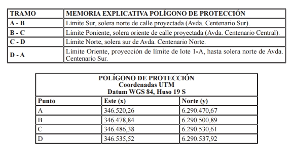 El área protegida tiene una superficie aproximada de 2.570,82 mts.2, como se grafica en el polígono con las letras A-B-C-D-A, del plano adjunto, que forma parte del presente decreto y cuyos límites son los siguientes: