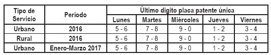 . 2. La prohibición señalada comenzará a regir desde la publicación en el Diario Oficial de la presente resolución hasta el 31 de diciembre de 2016 para los servicios rurales y hasta el 31 de marzo de 2017 para los servicios urbanos, y regirá de lunes a viernes, excepto festivos, desde las 7:00 AM hasta las 20:00 horas, contemplando todas las vías públicas de la provincia de San Antonio.