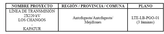 . Artículo 2°.- El proyecto denominado "Línea de Transmisión 2x220 kV Los Changos - Kapatur", estará destinado a conectar a las futuras subestaciones Los Changos y Kapatur, y forma parte de un proyecto de mayor extensión denominado "Sistema de Transmisión de 500 kV, Mejillones - Cardones", cuya finalidad es conectar la Central Térmica Mejillones 3, más otras unidades existentes y futuras localizadas en la Región de Antofagasta, provincia de Antofagasta, comuna de Mejillones, con la subestación Cardones, ubicada en la Región de Atacama, provincia de Copiapó, comuna de Copiapó, lo que permitirá satisfacer el constante crecimiento de la demanda de energía eléctrica en la Región de Atacama, y en los principales centros de consumo del país, además de mejorar las condiciones de operación y calidad de servicio del suministro eléctrico del sector.
