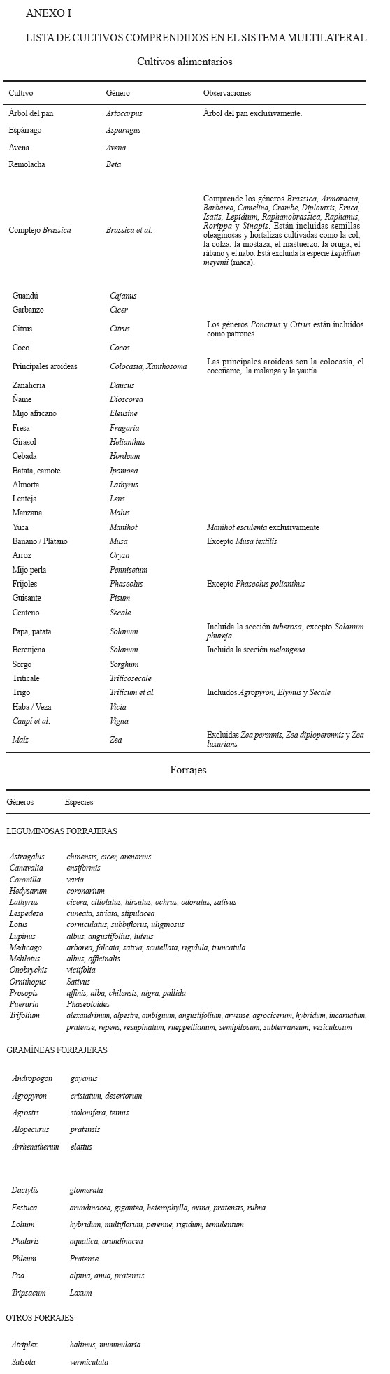 LISTA DE CULTIVOS COMPRENDIDOS EN EL SISTEMA MULTILATERAL