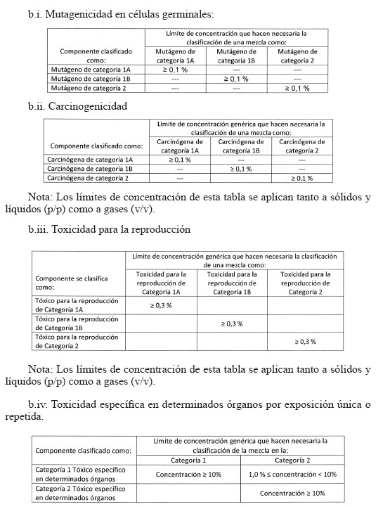 b) Para el caso que posea uno o más componentes listados con peligrosidad para la salud crónica, es decir, mutagenicidad en células germinales, carcinogenicidad, toxicidad para la reproducción y toxicidad específica en determinados órganos, por exposición única o repetida, se considerará el siguiente criterio, dependiendo de la concentración presente de la sustancia en la mezcla: