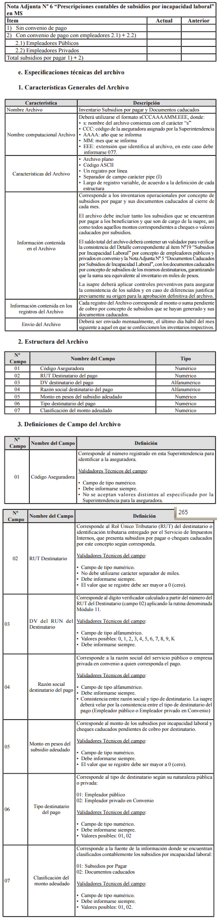 Las isapres deberán enviar a esta Superintendencia mensualmente, un archivo actualizado de los inventarios correspondientes a los cheques o documentos caducados por subsidios y los subsidios por pagar. Esta información deberá ser la misma del inventario instruido en los puntos precedentes, debiendo respaldar y cuadrar con los saldos obtenidos de la contabilidad que se detallan en el Informe Complementario mensual y que forman parte de la garantía.