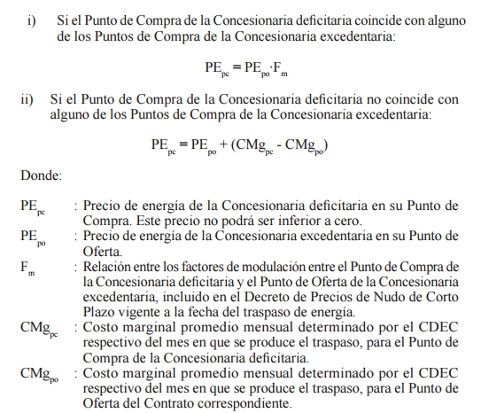 Para estos efectos, el CDEC determinará el costo marginal promedio mensual, correspondiente al promedio de los costos marginales horarios en el Punto de Compra y de Oferta respectivos durante el mes en que se produce el traspaso, ponderados por los volúmenes de energía horarios retirados para abastecer la demanda de la Concesionaria deficitaria.