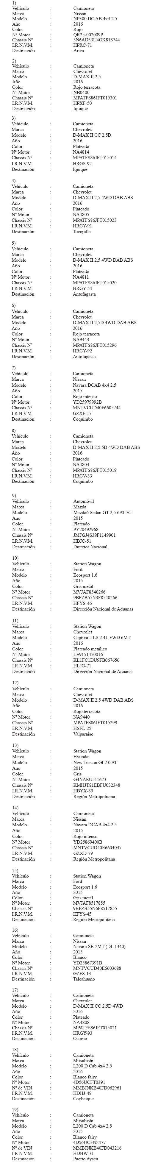 decreto ley Nº 799, de 1974, a los siguientes vehículos de dotación del Servicio Nacional de Aduanas: