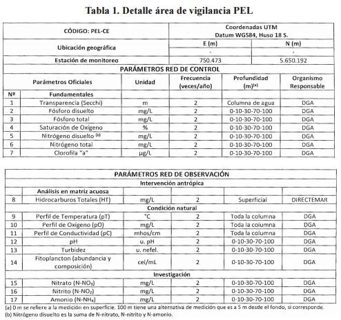 Artículo cuarto. Área de Vigilancia Sector Pelagial del Lago (PEL-CE). El área de vigilancia denominada "sector pelagial del Lago" corresponde a todo el cuerpo de agua pelágico cuyo límite horizontal está definido por la línea del veril 25 metros y cuyo límite vertical comprende desde la superficie hasta la profundidad máxima del lago. Las campañas de monitoreo tendrán las características y objetivos que se indican en la tabla 1: