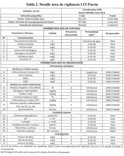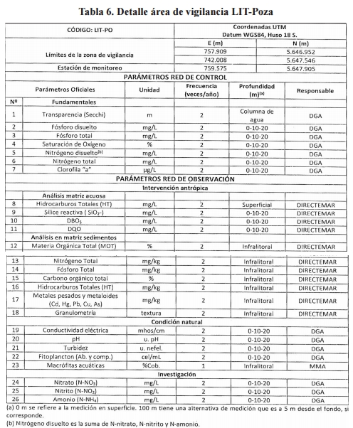 Artículo noveno. Área de Vigilancia Sector Bahía La Poza (LIT-PO). El área de vigilancia denominada "sector bahía La Poza" corresponde al cuerpo de agua que abarca desde el veril de 25 metros hacia la orilla del lago en todo su entorno, en el sector poniente del lago. Las campañas de monitoreo tendrán las características y objetivos que se indican en la tabla 6.
