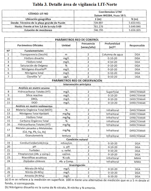 Adicionalmente, se establecen tres áreas de vigilancia complementarias para estos efectos, las cuales integran la red de observación. Sin perjuicio de lo anterior, en este programa se considera el monitoreo de otros parámetros de interés en las áreas de vigilancia que integran la red de control.