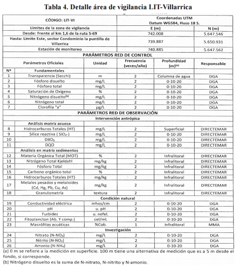 Artículo séptimo. Área de Vigilancia Litoral Sector Bahía Villarrica (LIT-VI). El área de vigilancia denominada "litoral sector bahía Villarrica" corresponde al cuerpo de agua que abarca desde el veril de 25 metros hacia la orilla del lago en todo su entorno, en el sector poniente del lago. Las campañas de monitoreo tendrán las características y objetivos que se indican en la tabla 4: