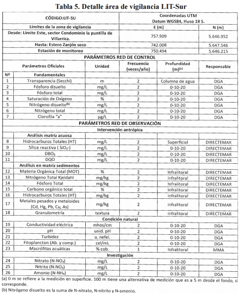 Artículo octavo. Área de Vigilancia Litoral Sur Sector Molco (LIT-SU). El área de vigilancia denominada "litoral sur sector Molco" corresponde al cuerpo de agua que abarca desde el veril de 25 metros hacia la orilla del lago en todo su entorno, en el sector sur del lago. Las campañas de monitoreo tendrán las características y objetivos que se indican en la tabla 5: